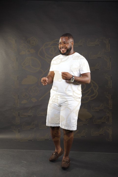 Un jeune-homme africain en noir , à genoux, jubilant , style décontracté et sportif