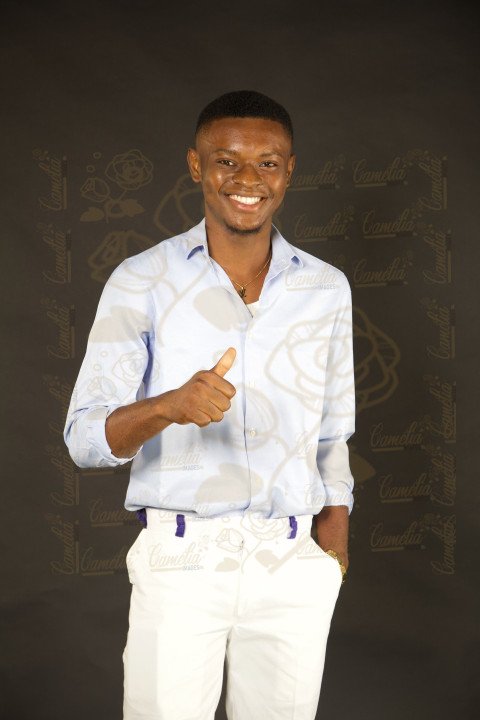 Jeune homme africain tenue Afrique pantalon noir tennis blanche téléphone