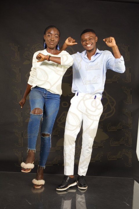 Un couple d'adulte africain assis sur des chaises , avec un look décontracté , des regards amoureux, tenant chacun une tasse