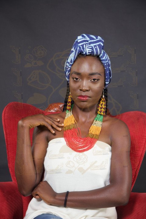 Maman africaine belle perruque rose fleurs fauteuil royal sourire bijoux