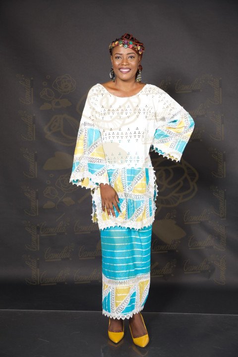 Femme africaine elegante colliers décoration coiffure talon jaune