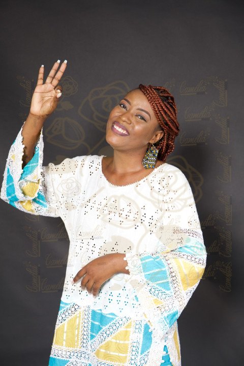 Femme Maman africaine grand sourire gestuel foulard ensemble pagne