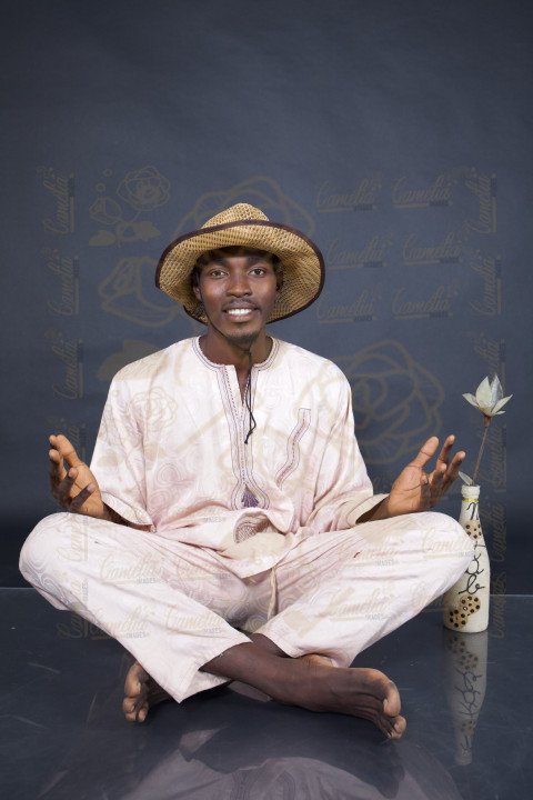 homme africain jeune teint chocolat pied croisés sourire chapeau soleil boubou assis pot de fleurSimilar Photos