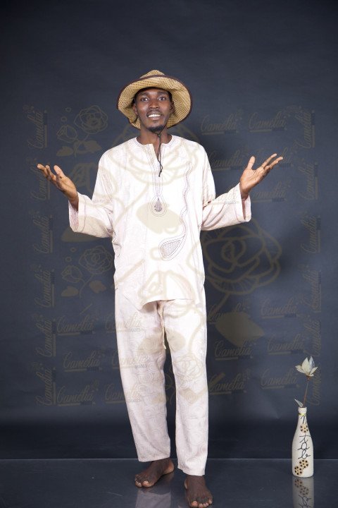 Jeune homme africain teint claire tenue Afrique pantalon noir tennis blanche