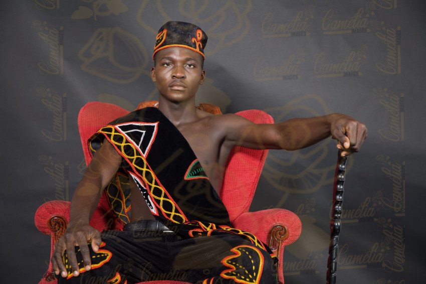 Homme siege chefferie tenue traditionnelle queue cheval canne main
