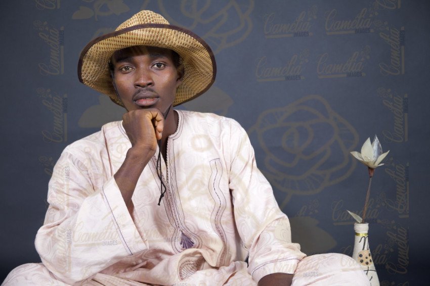 jeune homme africain main menton beau masculin boubou pot de fleur chapeau soleil peau noir teint noirSimilar Photos