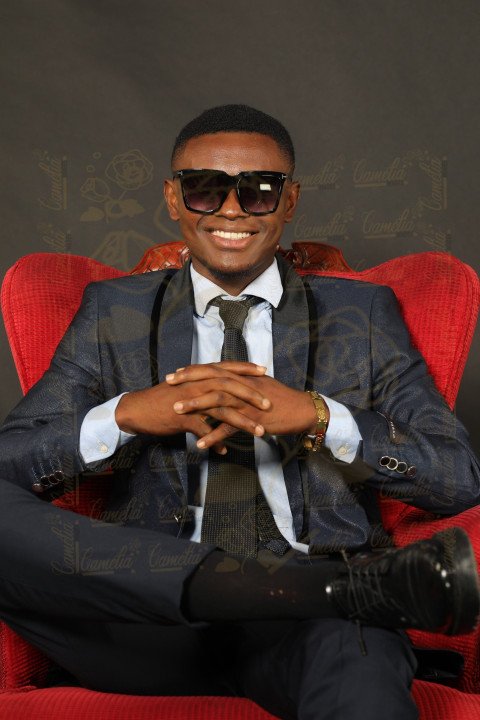 homme jeune africain teint claire lunette coistume chaussure noir uniforme style responsable montre chemise bleu cravatte charisme fauteuil rouge chemise bleu pied croisé poigné fermé regard fixe grand sourire lunetteSimilar Photos
