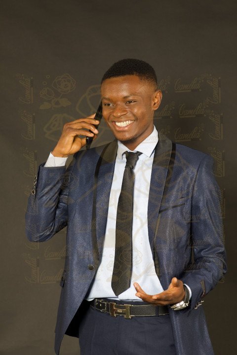 Jeune homme africain teint claire tenue Afrique pantalon noir tennis blanche téléphone