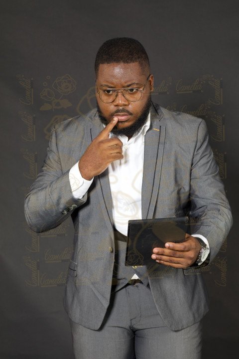 Femmes Africaines teint chocolat veste noire bleu et jaune negociation business