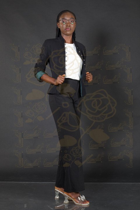 Jeune femme africaine veste noire t-shirt blanc jolie sourire bras croisés