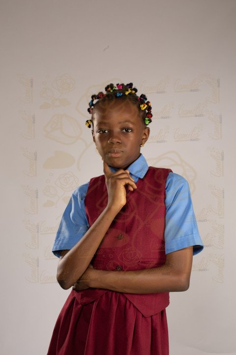 Portrait Petite écolière africaine uniforme couleur bordeaux chaussures noires mains menton