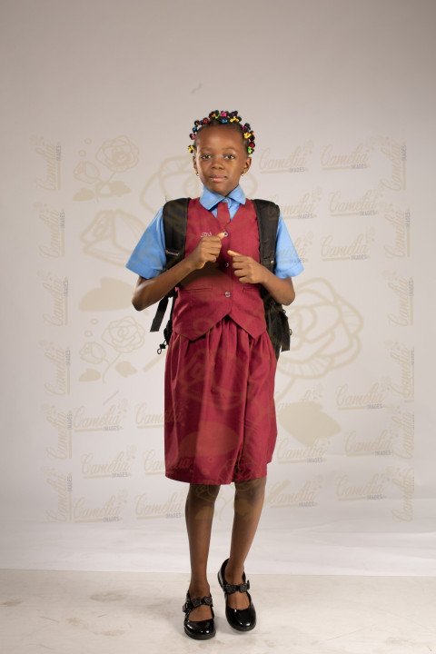 Jeune petite écolière africaine uniforme école gestuel pied mains bras jupe