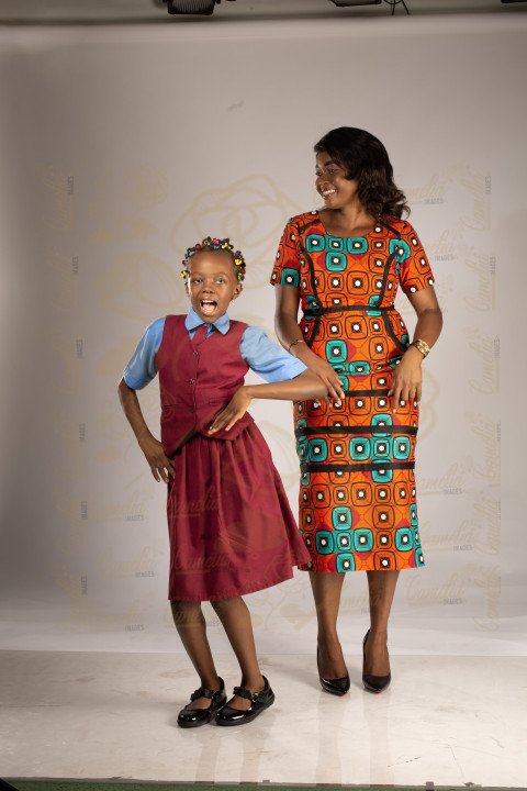 Maman africaine fille petite écolière gestuel mains lever direction gauche