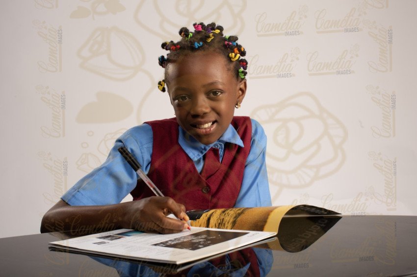 Jeune petite fille africaine belle grand sourire tenue classe chaussures noires coiffure matoba