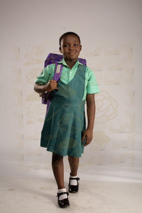 Jeune petite écolière africaine uniforme scolaire chemise robe verte chaussure noire