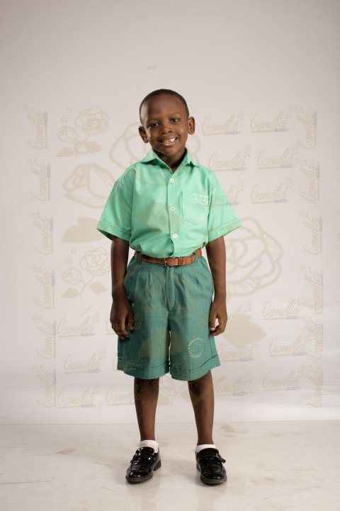 Jeune petite écolière africaine uniforme scolaire chemise robe verte chaussure noire