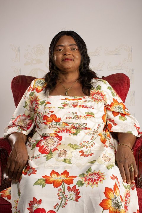 Maman africaine belle perruque rose fleurs fauteuil royal sourire