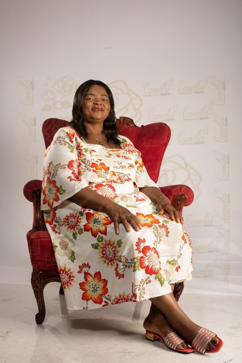 Maman africaine belle perruque rose fleurs fauteuil royal sourire pieds croisés