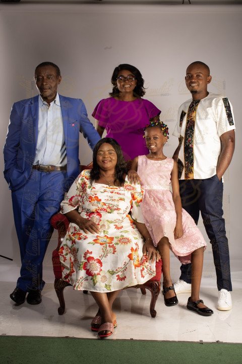 Famille Africaine papa maman fille sourire costume bleu paire noire robe fleur