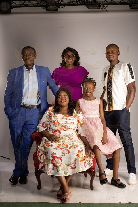 Famille Africaine papa maman fille sourire costume bleu paire noire robe fleur grand sourire