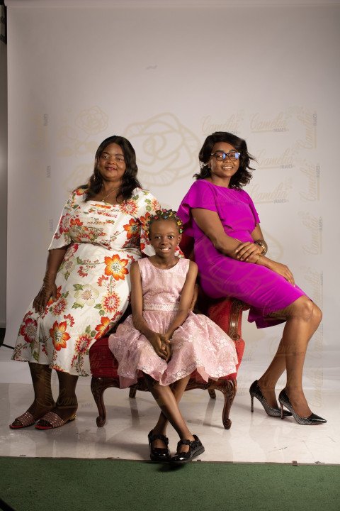 Famille Africaine maman fille sourire costume bleu paire noire robe fleur