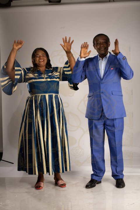 Couple africain Age mature sourire élégant costume bleu robe basin gestuel sourire joie
