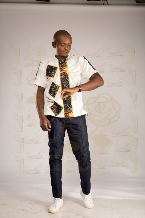 Jeune homme africain teint claire tenue Afrique pantalon noir tennis blanche montre main