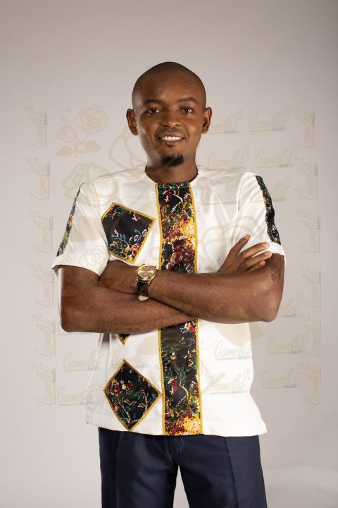 Jeune homme Africain beau veste design afritude mains poches barde menton