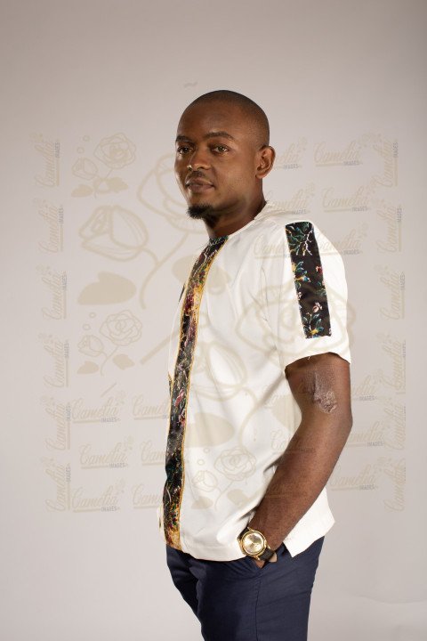 Jeune homme africain teint claire tenue Afrique pantalon noir tennis blanche mains poches