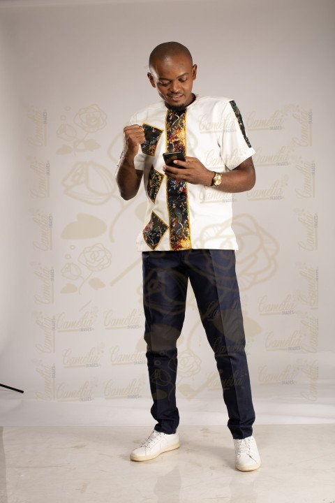 Jeune homme africain teint claire tenue Afrique pantalon noir tennis blanche gestuel expression