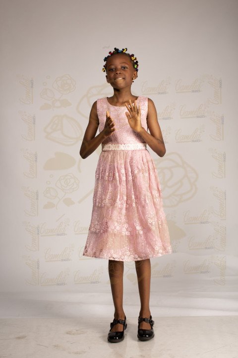 jeune petite fille gestuel mains coiffure matoba robe rose chaussure noire