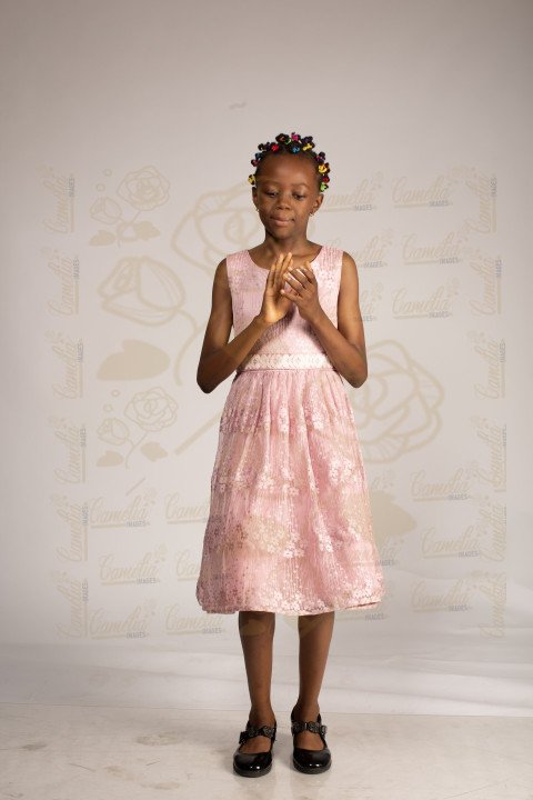jeune petite fille gestuel mains coiffure matoba robe rose chaussure noire