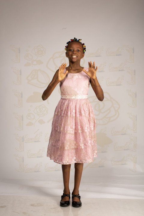 jeune petite fille expression visage coiffure matoba robe rose chaussure noire
