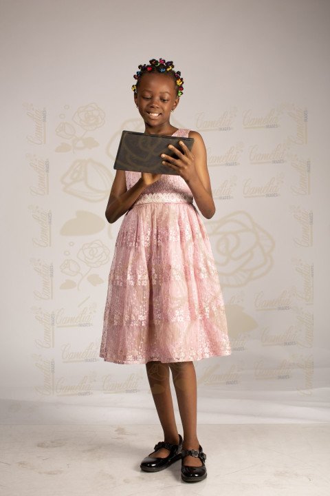Petite fille Africaine sourire coiffure matoba robe rose chaussure noire tablette