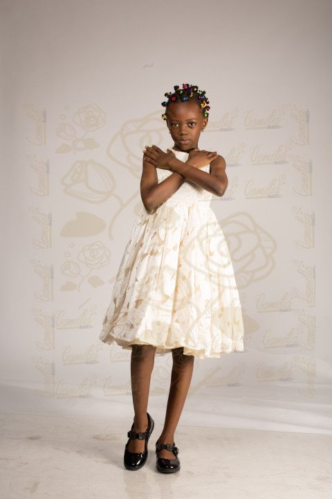 Posture mannequin Jeune petite fille africaine belle expression visage robe blanche fleurs