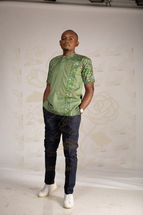 Jeune homme Africain beau veste design afritude mains poches barde menton