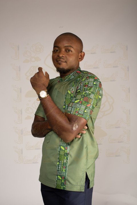 Famille Africaine papa maman fille sourire costume bleu paire noire robe fleur