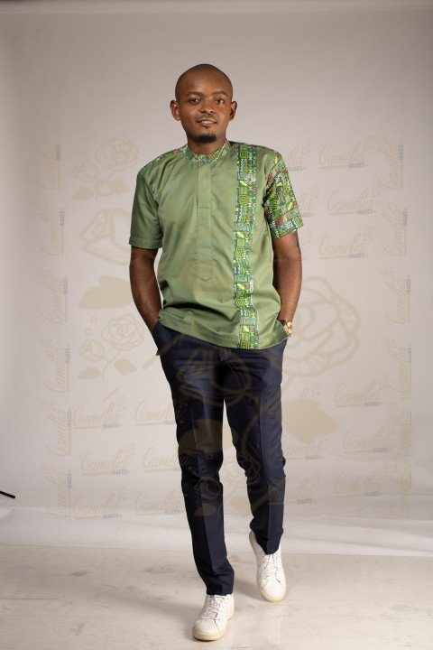 Jeune homme Africain beau veste design afritude mains poches barde menton