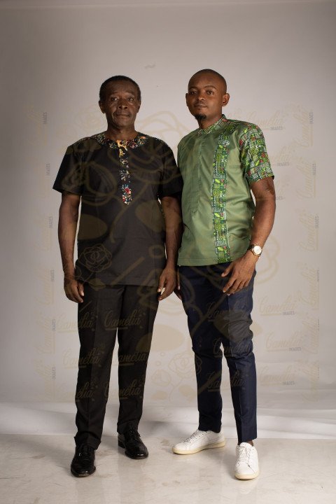 Père et fils teint noire claire paire noire chaussure blanche veste verte