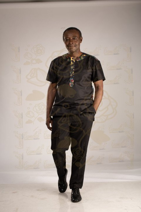 Homme africain souriremature veste noire paire noire déplacement mains poches