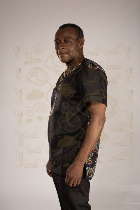 Homme siege chefferie tenue traditionnelle queue cheval canne main