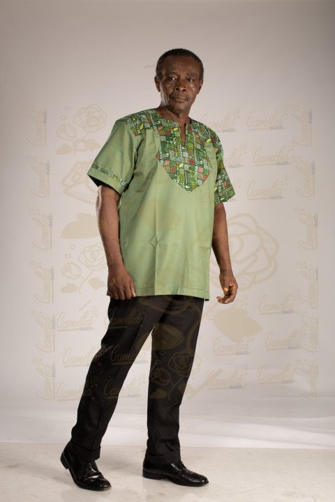 Homme mature expression sourire veste verte pantalon noir paire noire