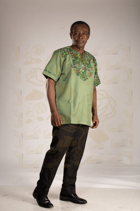 Homme mature expression sourire veste verte pantalon noir paire noire