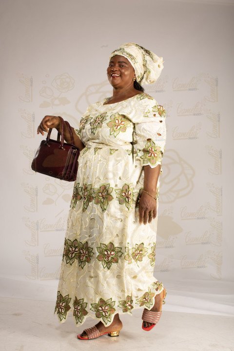 Maman africaine sourire ensemble pagne foulard sac main rouge lèvre