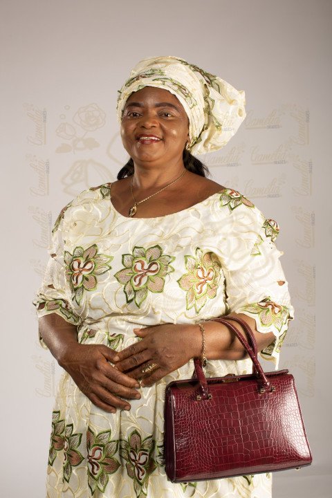 Maman africaine sourire ensemble pagne foulard sac main rouge lèvre bijoux