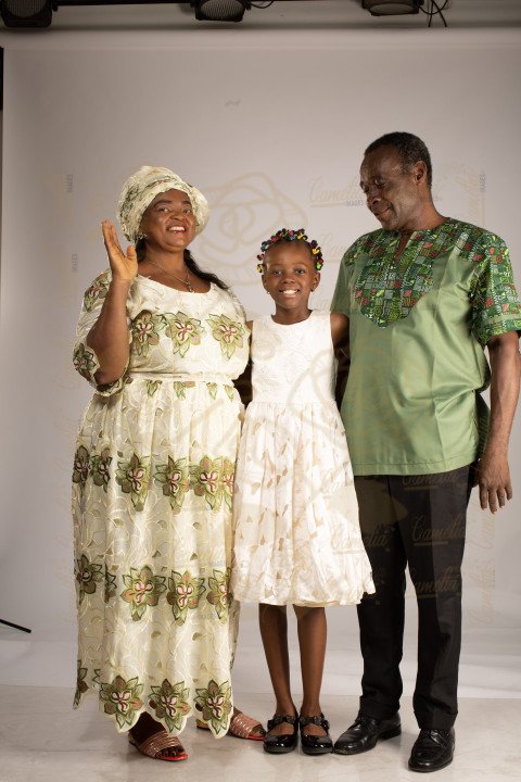 Famille Papa Maman Petite fille sourire dent blanche robe fleurs foulard
