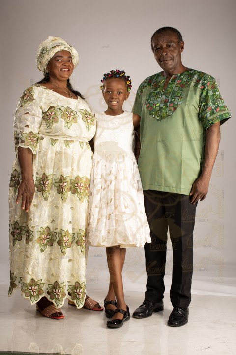 Famille Africaine maman fille sourire costume bleu paire noire robe fleur