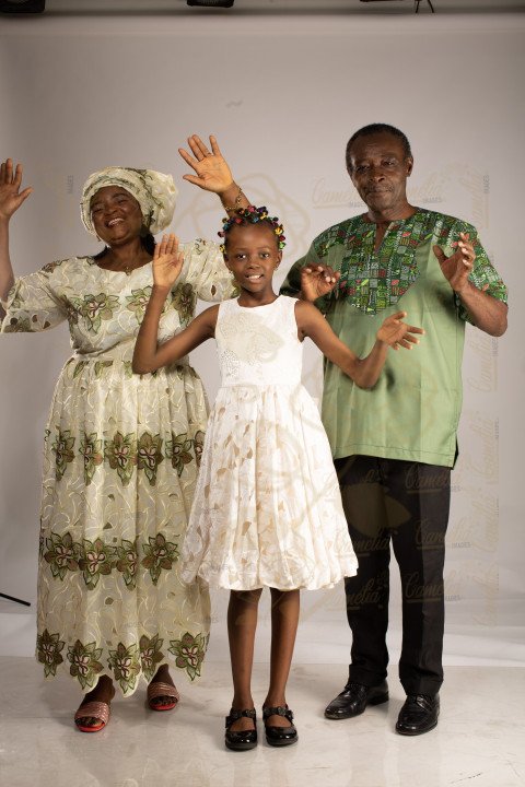Famille Papa Maman Petite fille sourire dent blanche robe fleurs foulard