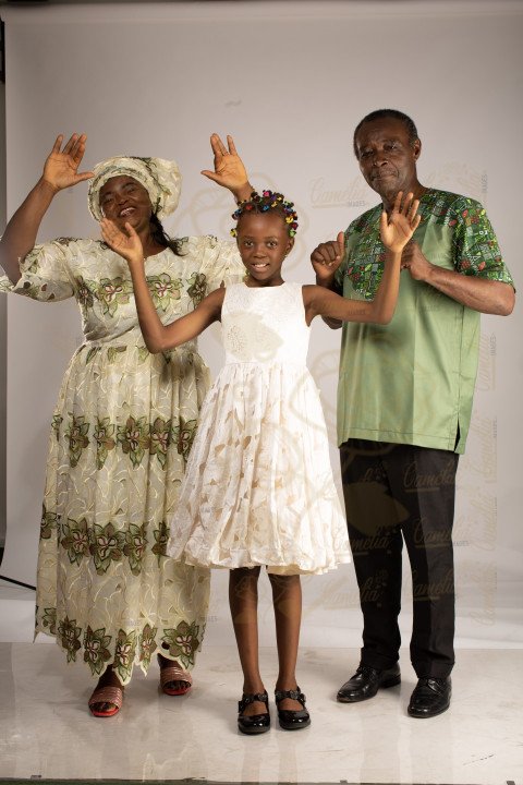 Famille Papa Maman Petite fille sourire dent blanche robe fleurs foulard