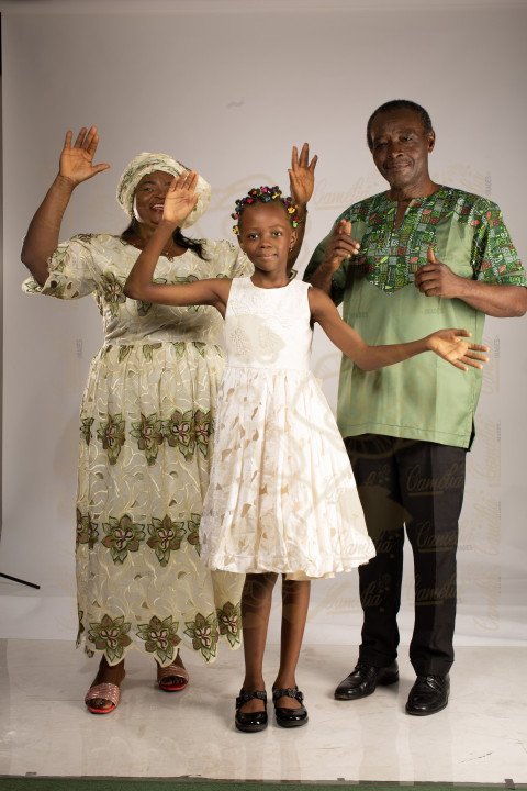 Famille Papa Maman Petite fille sourire dent blanche robe fleurs foulard